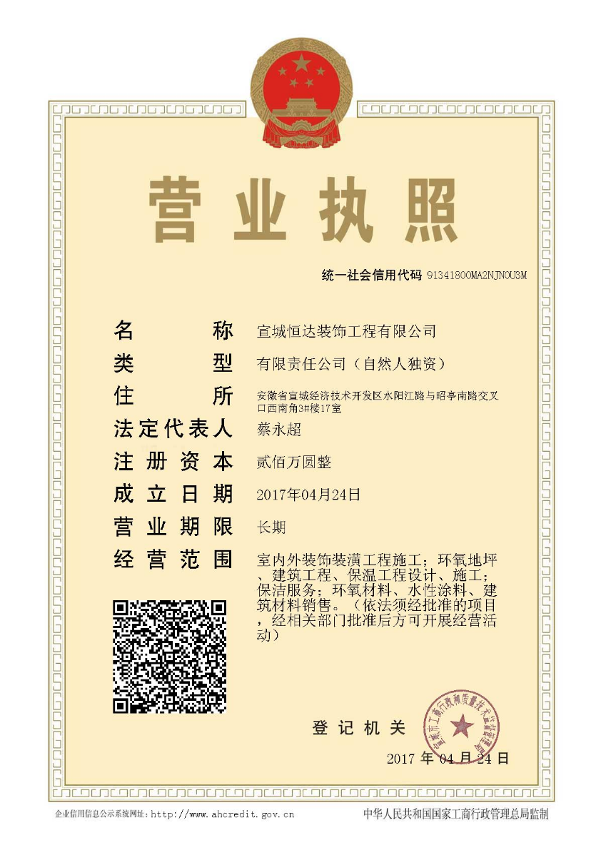 - 安徽恒达装饰工程有限公司主要经营室内外装饰装潢工程施工、环氧地坪漆、固化地坪、建筑工程、保温工程设计、施工;保洁服务;环氧地坪漆、水性涂料、建筑材料销售。(依法须经批准的项目,经相关部门批准后方可开展经营活动) 安徽恒达装饰工程有限公司是一家从事现代化工业厂房地坪、墙面涂料研发、设计、施工于一体的专业化公司。公...